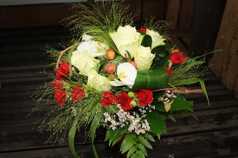 Bouquet rond champêtre par votre artisan fleuriste Lorient dans ses couleurs rouge et blanc.