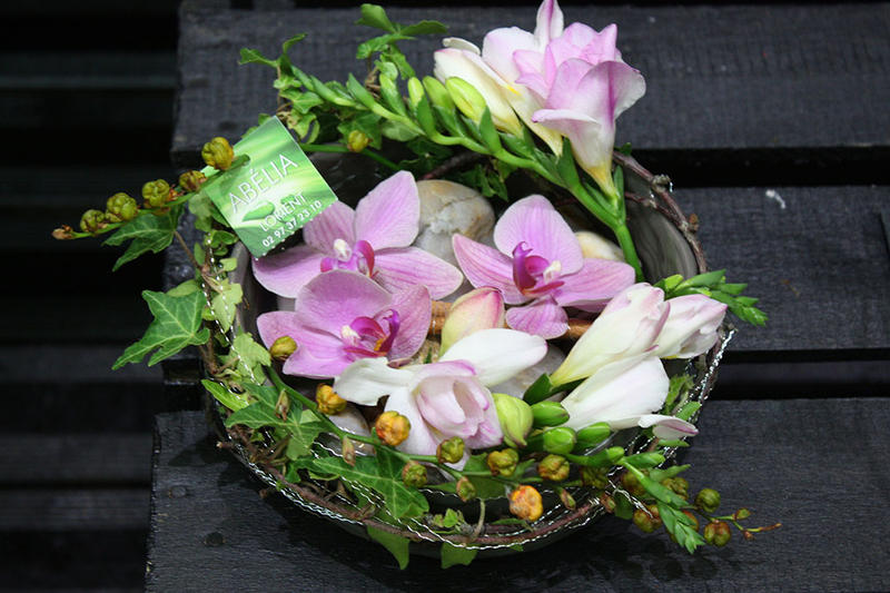 Dans cette composition on retrouve du phalénopsis et du freesia qui s’enroulent dans un contenant (diamètre 12 cm environ) garni de galets.