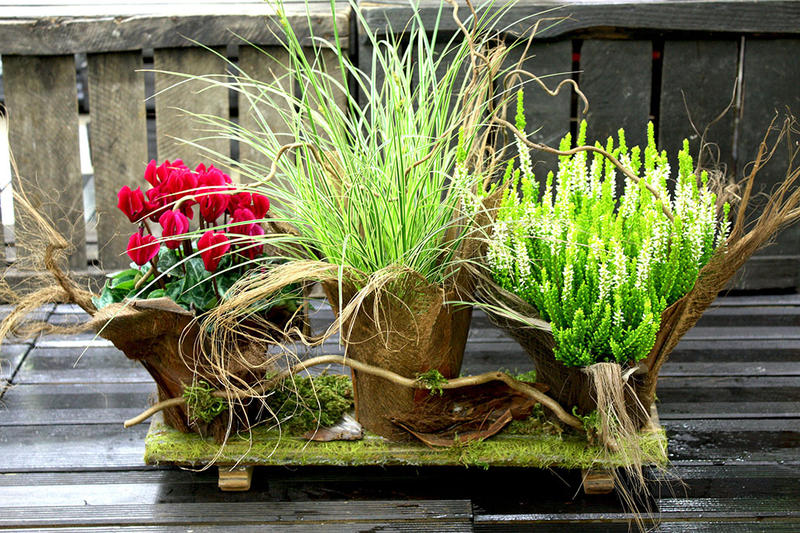 Votre fleuriste Abélia Lorient vous propose cet ensemble original de plantes vivaces verte et fleurie enroulées dans une feuille de cocos sur un plateau de mousse.